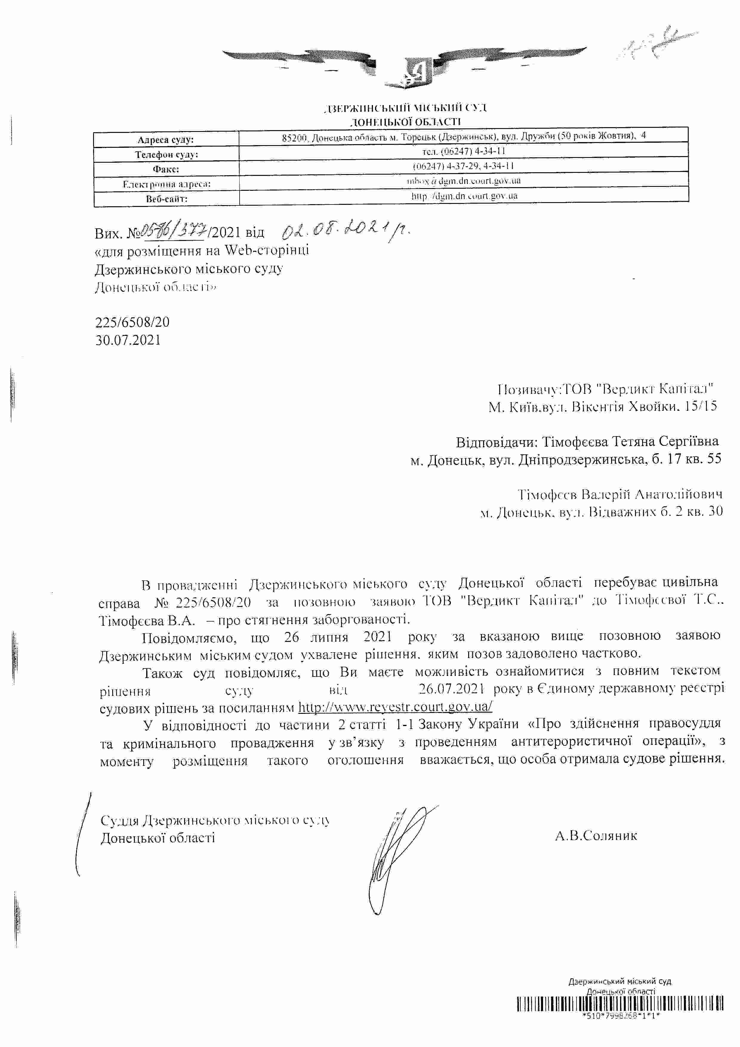 Повідомлення про винесення рішення по справі за позовом ТОВ "Вердикт Капітал" до Тімофєєвої Т.С., Тімофєєва В.А.