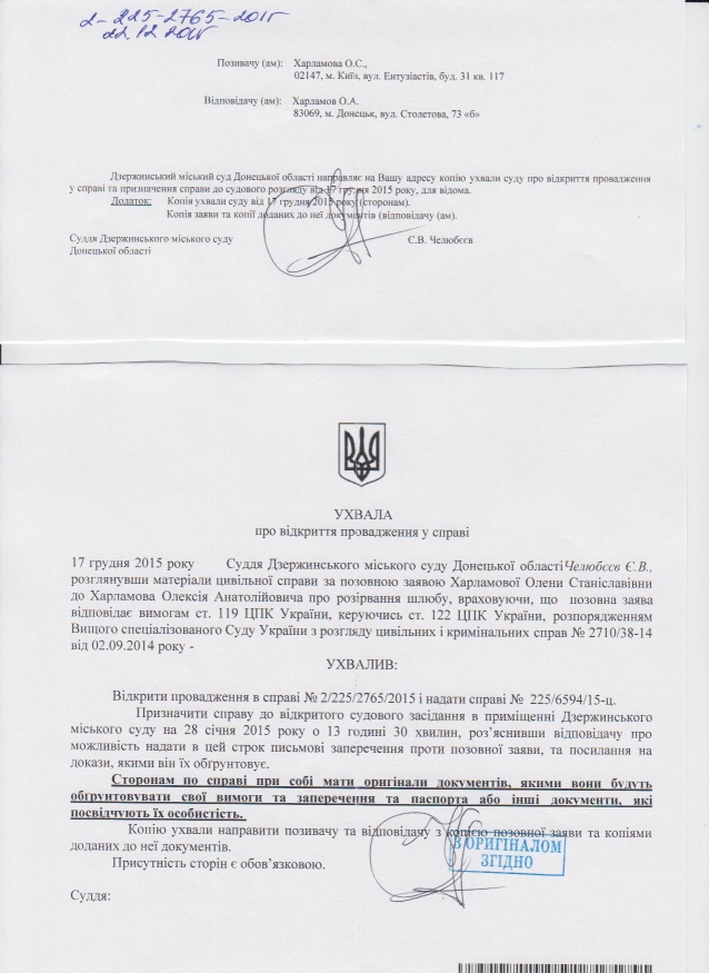 Виклик сторін до суду по справі Харламової О.С. до Харламова О.А.